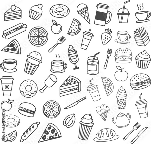 Hand Drawn Food and Drink Doodle Icon Set – Vector Illustrations of Fast Food, Snacks, Coffee, Tea, Desserts, Fruits, and Kitchen Elements for Menus, Blogs, Planners, and Creative Projects
