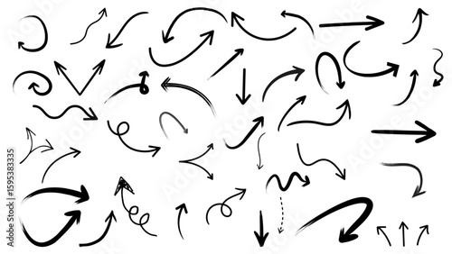 hand drawn Grunge arrow vector set. Black, sketchy, diverse shapes, directions for design, illustration. Straight, curly, circular arrows on white background