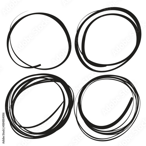 Hand drawn ink line circles, scribble circle, circular doodle sketch scribbles, round frames isolated