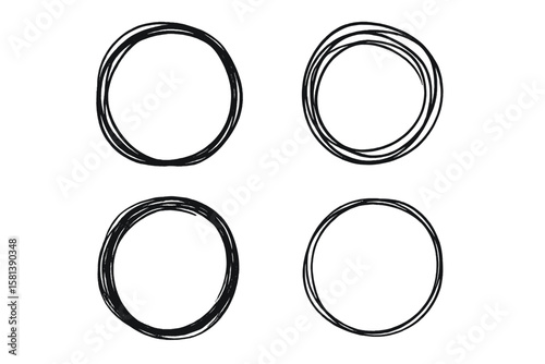 Hand Drawn Irregular Circle Sketches Set of 4, Abstract Doodle Frames, Artistic Round Borders, Simple Line Art Vector, Modern Minimalist Design Elements