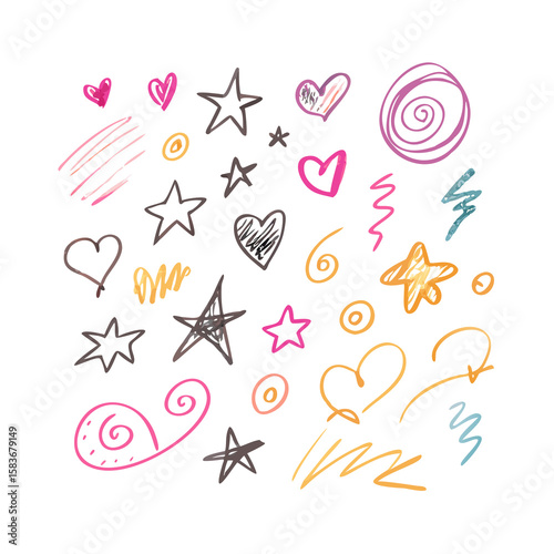 Hand drawn line chalk brush stroke arrow icon set. Chalk crayon underline, check mark, scribble and texture in rough hand sketch style. Drawn heart, frame, star design shapes. Vector illustration