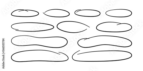 Hand drawn long circle ovals set. Ellipses of different widths. Highlight circle frames. Elipses and ovals in doodle style. Set of vector illustration isolated on white background.