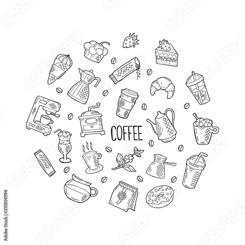 Hand drawn round concept with coffee and dessert icons in doodle style. Black outline isolated on a white background. Cute template for coffee shop or cafe, menu, cards, banners. Vector illustration