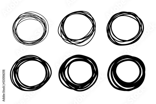 Hand drawn scribble. Hand drawn circles sketch frame set. Doodle circular logo design elements. Abstract geometric backdrop.