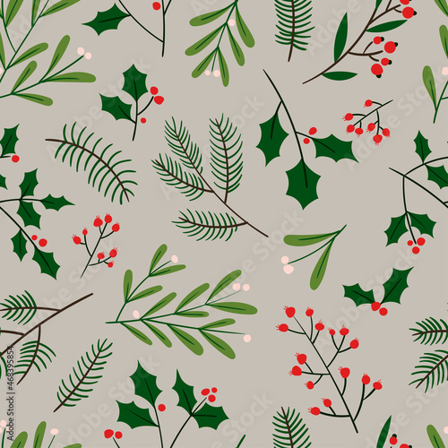 Hand drawn seamless vector pattern. Winter themed background with branches. Holiday texture for your design. Merry Christmas