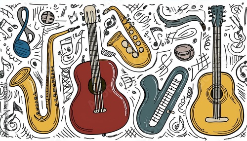 Hand drawn set of different types musical instrument, guitar, saxophone. Doodle sketch style. Isolated perfect any project. for music shop icon, musical instrument store, music course, background