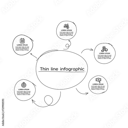 Hand drawn thin line infographic design with circles and financial icons for Business process steps with options.