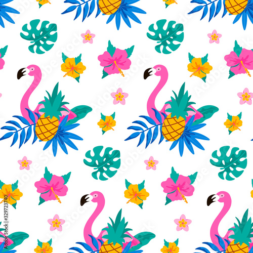 Hand drawn tropical seamless pattern with flamingo, palm tree, monstera leaves and pineapple on white background. Vector illustration