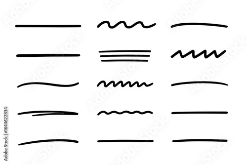 Hand drawn underline set. Vector doodle lines collection. Sketch brush strokes, wavy dividers, and marker highlights for text. Ink pen scribble shapes. Grunge border elements.
