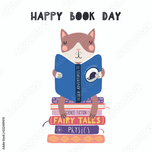 Hand drawn vector illustration of a cute funny cat reading a book, with quote Happy book day. Isolated objects on white background. Scandinavian style flat design. Concept for children print.