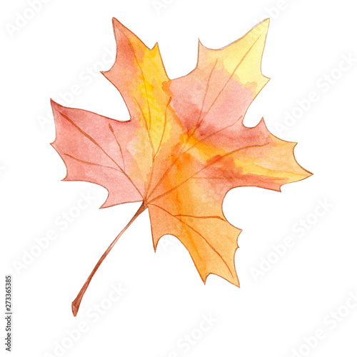 Hand drawn watercolor colorful maple fall leaf isolated on white background.Illustration sketch for invitation, print or greeting cards