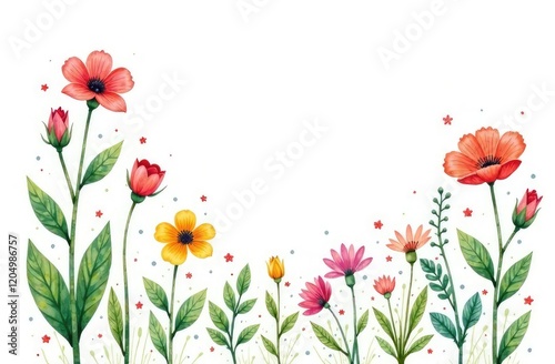 Hand drawn watercolor illustration of differents plants with colorful blot. Decorative graphic frame for wedding branding, invitations, greeting card. Isolated on white background. Ecology concept