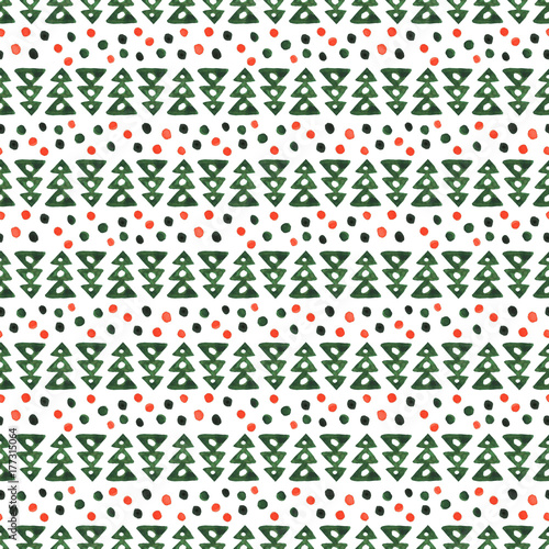 Hand drawned seamless watercolor pattern. Abstract watercolor trees and dots in red and green isolated on white background. Seamless pattern with stylized trees and dots. Perfect for wrapping paper.