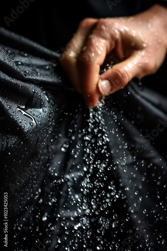 hand gently pulls black fabric, causing droplets of water to cascade down, showcasing texture and water resistance of material. scene captures moment of interaction with fabric