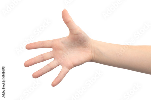 Hand gesture palm open with five fingers, isolated on a white background, young female hand close-up