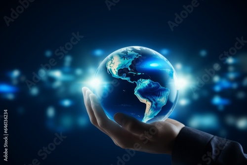 Hand hands holding earth planet hologram infographics ecology ai artificial intelligence cyberspace climate pollution protection nature care responsibility environmentalism technology modern solutions
