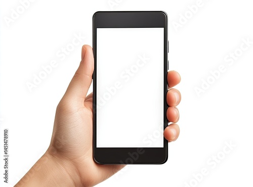 Hand holding a black smartphone with a blank screen. The phone is presented in a clear, isolated shot against a white background, highlighting the device's form and display