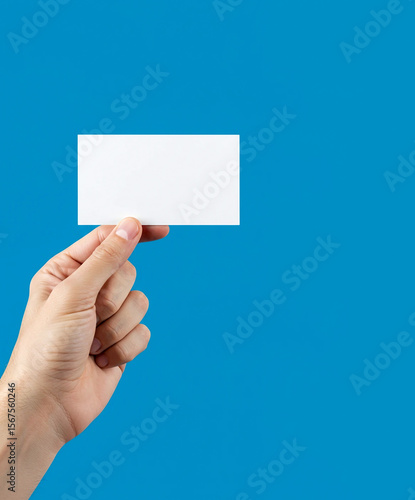 Hand Holding a Blank Business Card Against a Blue Background