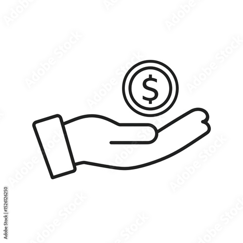 Hand holding a coin with a dollar sign, symbolizing money, finance, payment, or donation in a simple black line icon style