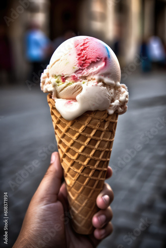 Hand holding a fresh cream and strawberry ice cream cone during summer