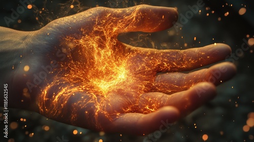Hand holding a glowing fuse with spark effects symbolizing energy and power in a mystical and imaginative context