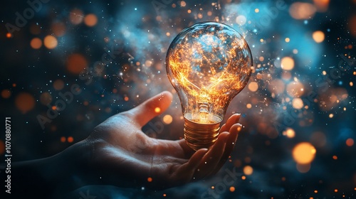 Hand holding a glowing light bulb with sparks.