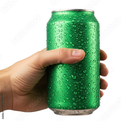 Hand holding a green soda can with water droplets isolated on transparent background