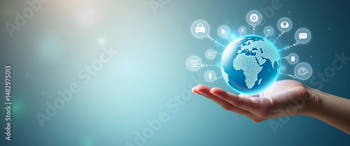 Hand holding a holographic multilingual translation globe with speech bubbles and language icons, symbolizing global communication in an empty space concept.