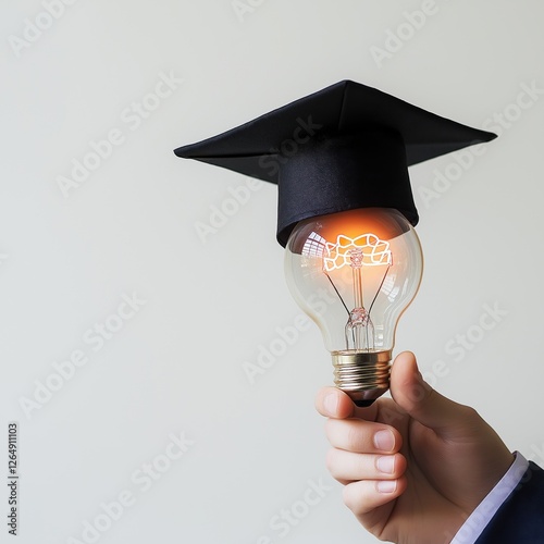 hand holding a light bulb with a black graduation cap on top of it. The light bulb is in the shape of a lightbulb and is emitting orange rays of light.