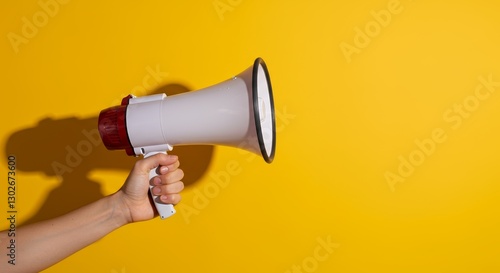 Hand holding a megaphone against vibrant yellow backdrop with sharp lighting