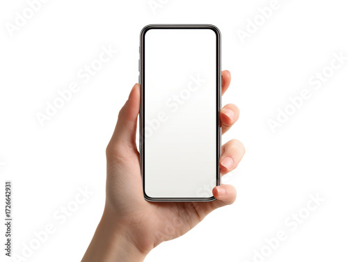 Hand holding a smartphone with blank screen for creative design on a transparent background, cut out