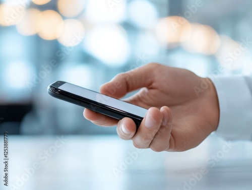 Hand holding a smartphone with blurred background.