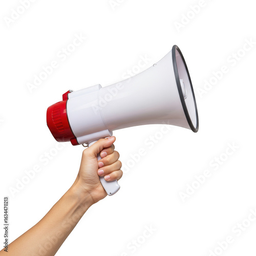 Hand holding a white and red megaphone, public address system isolated on transparent background