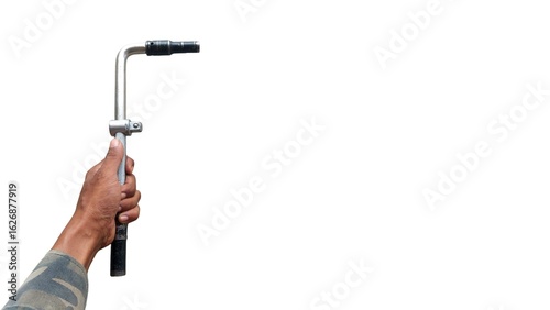 Hand Holding Car Tire Wrench. Isolated on white background with text space.