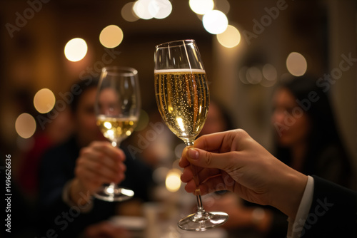 Hand holding champagne flute toasting at dinner party celebration. Close up of cheers with sparkling wine. Festive social gathering concept with bokeh lights.