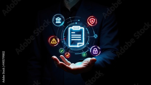 Hand holding digital icons for risk management and assessment on a dark background, symbolizing business strategy and control
