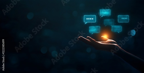 Hand holding glowing digital chat bubbles, communication and AI chatbot technology concept