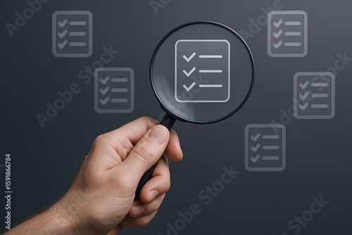 Hand holding magnifying glass over checklist icons representing inspection and quality control.