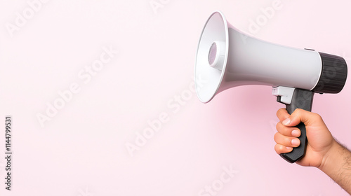 hand holding megaphone against soft pink background, symbolizing communication and expression. This captures essence of conveying messages effectively