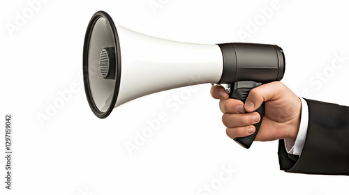 Hand holding megaphone in a business setting during a presentation or announcement