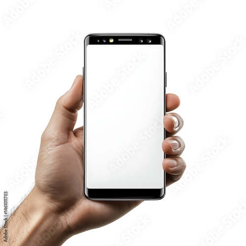 Hand Holding Modern Smartphone: A hand holds a modern smartphone with a blank screen, ready to showcase your app, website, or design. The device is positioned against a neutral backdrop for a clean.