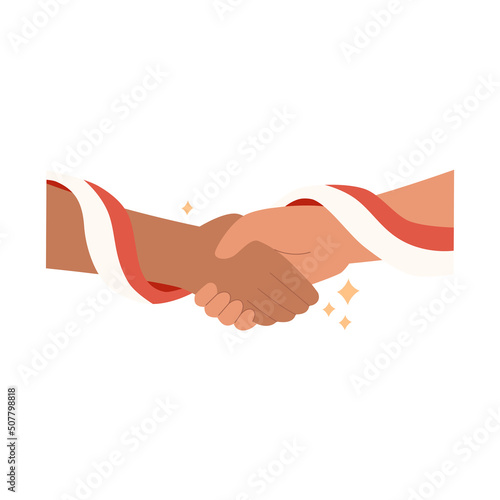 Hand holding national flag flat design style. Handshake, couple of hand. Independence Day of Indonesia celebration