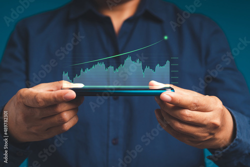 Hand holding of a mobile phone with digital increasing bar business graph growth