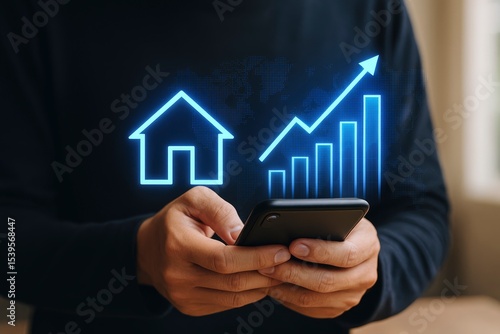 Hand Holding Phone with Digital House & Rising Graph Showing Property Market Increase and Tech Solutions