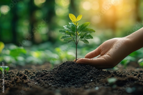 hand holding small tree in soil on green blurred background with sunlight eco conservation theme