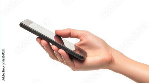 hand holding smartphone against white background, showcasing modern technology and communication. This captures essence of connectivity and convenience in daily life