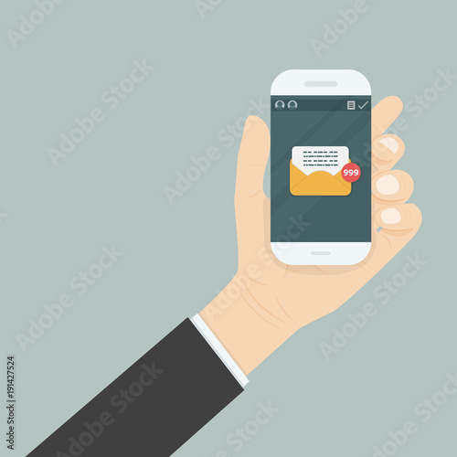 Hand holding smartphone and touching screen with text messaging.Smartphone with new message on screen.Chat,SMS,Instant messaging.Mobile messenger concepts for web sites.Web banners.