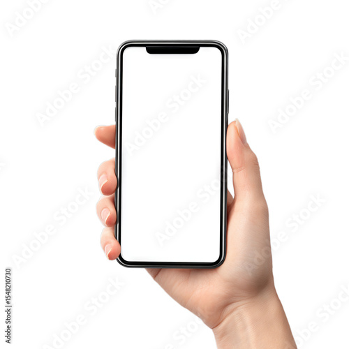 Hand holding smartphone with blank screen. Isolated white background. Png format