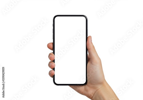 Hand holding smartphone with blank screen on white background for technology and mockup concept