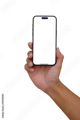 Hand holding the black smartphone iphone with blank screen and modern frameless design in two rotated perspective positions - isolated on white background - Clipping Path